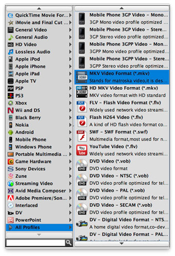 You can click "Profile" drop-down list to open a new list, where you can input "MKV" in the search box, then the result will show up in the right.