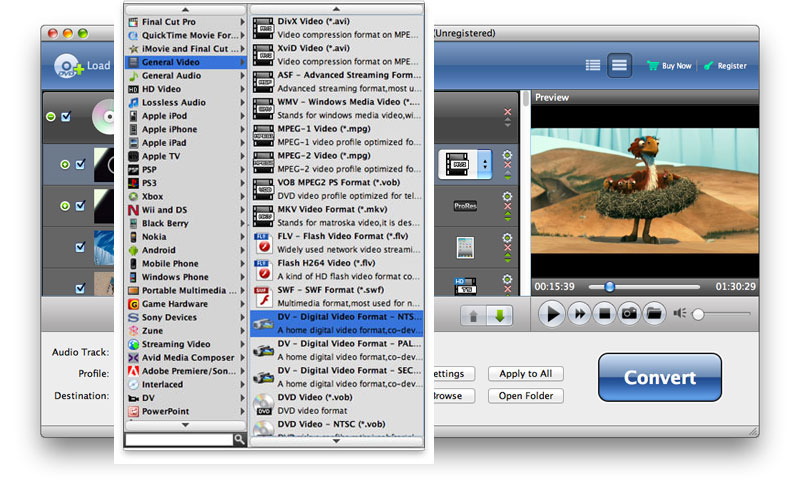 Inset your DVD disc to your Mac. After that, you can click "Load DVD" button on the toolbar to load the DVD to the program. And you can click the drop-down arrow right beside the "Profile" column, and then you can see the "Profile" window. Here you can select "General Video > DV – Digital Video Format – NTSC (*.dv)" from the drop-down list. Or you can select other DV format as you like.