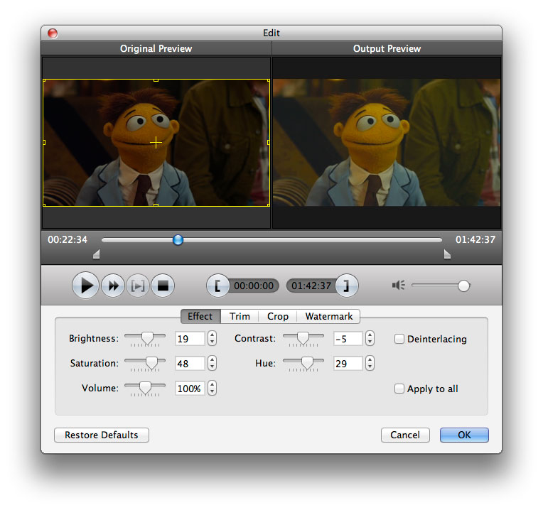 With this amazing DVD ripper, you can adjust the video effect as you like. Click "Effect" button on the toolbar and open the "Edit" window. Here you can adjust the video effect like Brightness, Contrast, Saturation, Hue and Volume to meet your needs. What you need to do is to drag the slide bar to change the value of the corresponding effect; or input the value you want in the corresponding box to change the effect.