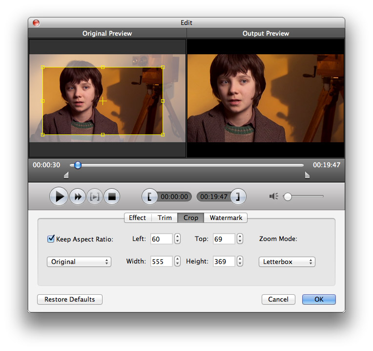 Not satisfied with the video frame? You can cut off the black edge of the video frame or adjust the video frame as you like. Click "Crop" button to open the "Edit" window. Here you can check "Keep Aspect Ratio" option, and then you can choose Original, Crop area, 16:9 and 4:3 to meet your needs. In addition, you can adjust the distance of the frame to left and top as well as its width and height.