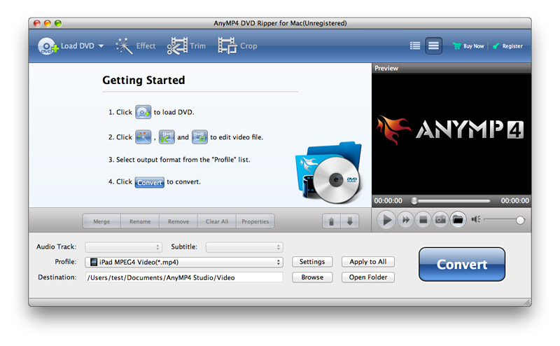 AnyMP4 DVD Ripper for Mac can help you rip DVD to VOB with high quality very easily. Also, you can take out audio files from the DVD movies and save them as your favorite audio format. Besides powerful ripping function, it can act as the wonderful video editing software. You can adjust the video effect, trim any length of the video, crop the video frame, add text/image watermark in the video and join several clips into one file. With creative and flexible features, you can preview the source and targeted video, and also capture your favorite DVD video image as wallpaper. In a word, you can get your ideal video with this Mac DVD Ripper. The tutorial mainly introduces the simplest way to rip DVD to VOB on Mac.