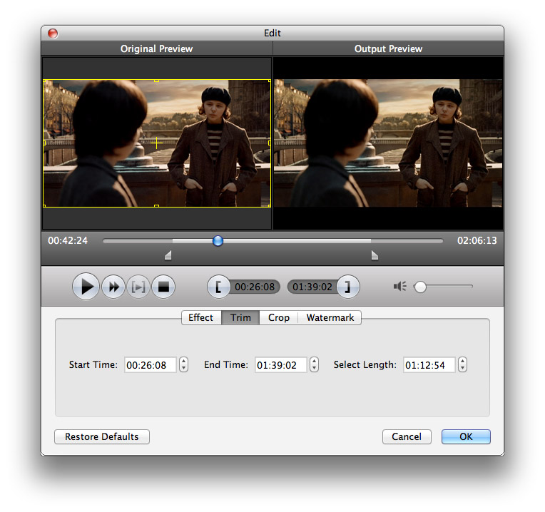 If you just want to enjoy one part of the DVD videos, you can trim your unwanted video part at will. Select the video you want to trim length, and then click "Trim" button to open the "Edit" window. Here you can drag the slide block to decide the start point and end point; or you can input the time you want in the Start Time and End Time box. After that, you can see the selected length in the Select Length box.